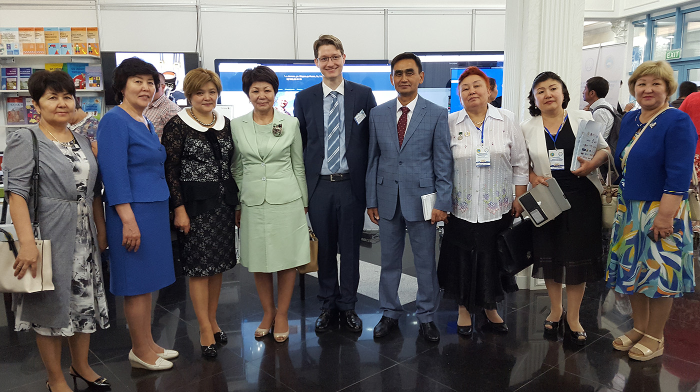 Pictured above are conference members, notably: Beybitkul Karimova (third from left), CEO of Uchebnik, Peter Torok (center), deputy CEO of Mozaik, and Duysebek Adilhan Telegenuli (center, right), deputy CEO of Uchebnik.