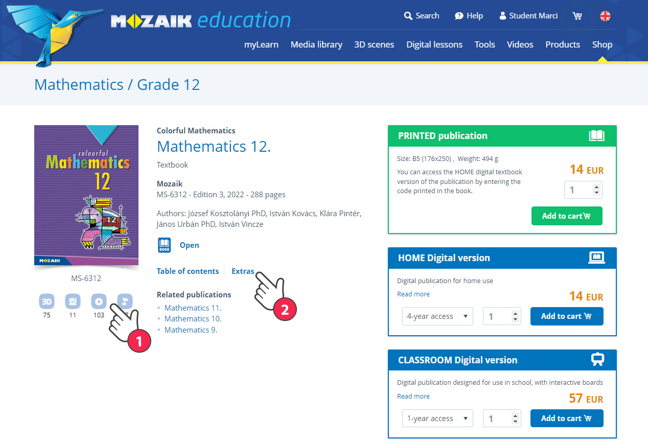 Choose a publication in the webshop and click on its thumbnail image. On the following page, you will find the number and type of extras under the book cover image (1). Click on the 'Extras' link to see the extras included in the book (2).