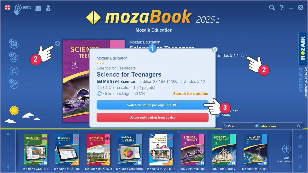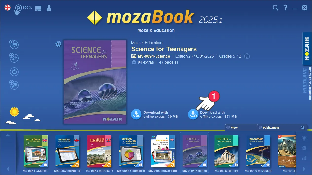 No mozaBook, você pode baixar as versões online e offline dos livros didáticos. As versões offline requerem sempre um pouco mais de espaço em disco, mas poderá abrir a publicação e utilizar todo o conteúdo interactivo no seu interior (3Ds, vídeos, exercícios) sem uma ligação activa à Internet.