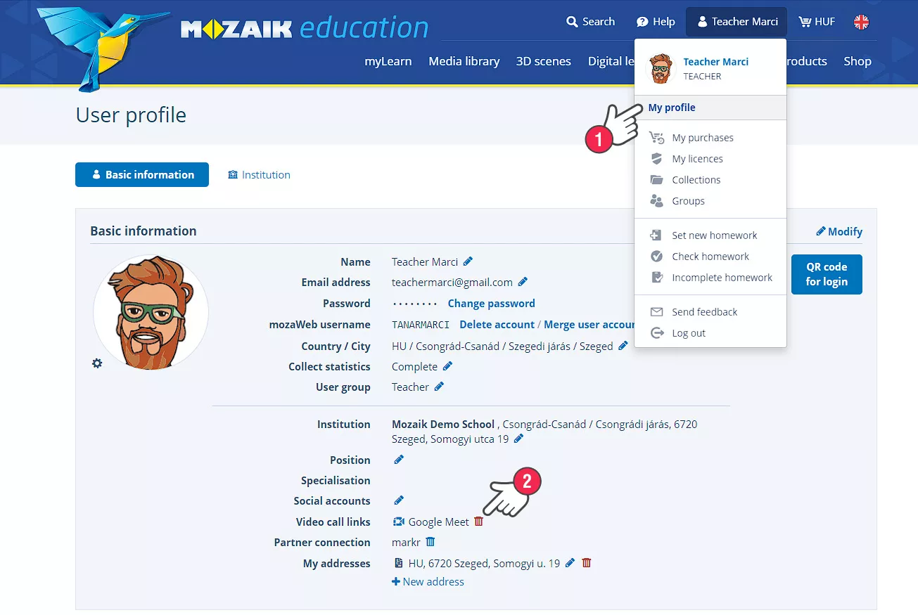 When you start a video conference, your mozaWeb account will be linked to your chosen video conference service user account. If you want to remove your user account and add another to your mozaWeb account (for example, add an account with a subscription), then on the My profile (1) page, in the video call links row, click on the bin icon (2) next to the service provider’s name. By doing this, the next time you start a video conference, you will have to log in to your user account again. (The row with the video conference links appears only if there is a user account added to your mozaWeb account.)
