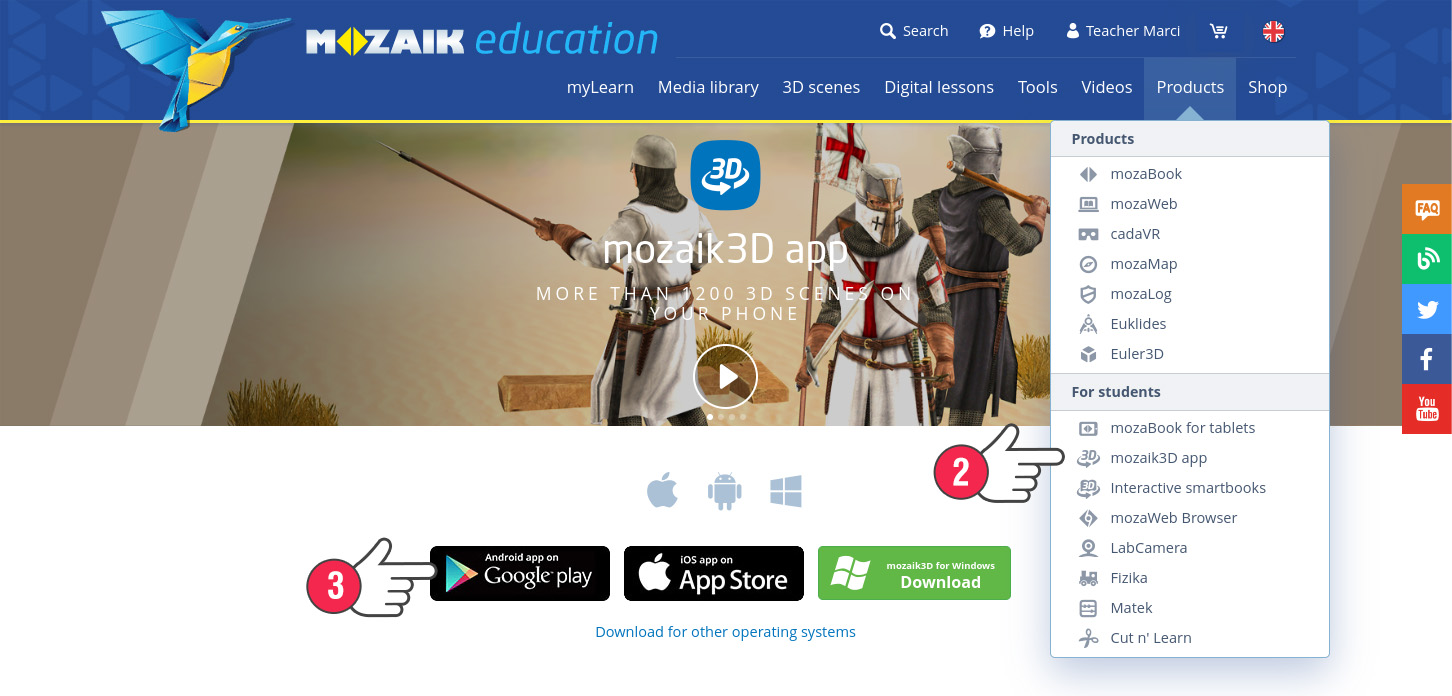 You can also find the mozaik3D application in the Products menu (2). You can start the installation from here by clicking on the Google play button (3).