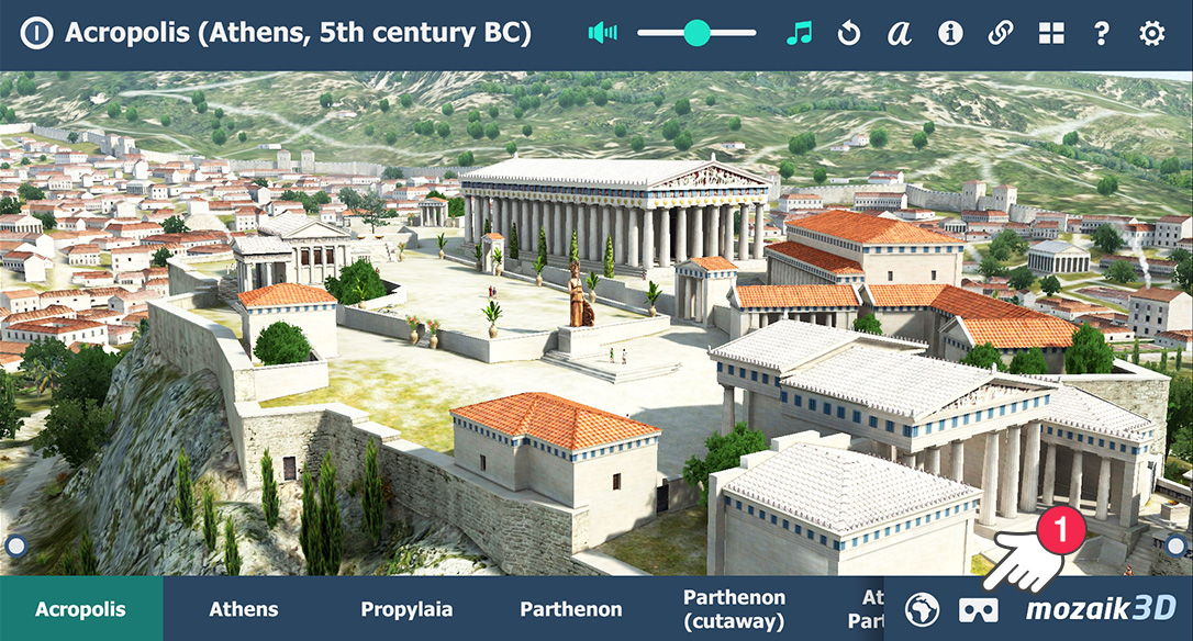 Você pode dar um passeio virtual na maioria das cenas 3D com um headset VR. Para isso, você precisa de um headset VR no qual você possa colocar seu smartphone, e o aplicativo mozaik 3D que você pode baixar gratuitamente.