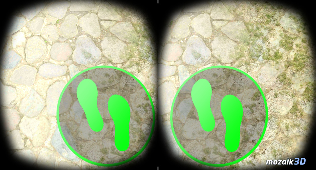 Para iniciar sua caminhada virtual no modo andar, mova a cabeça para baixo até que o ícone fique verde. Andar é automático e você vai na direção que você está olhando. Para parar a caminhada virtual, mova a cabeça para baixo novamente até o ícone ficar vermelho.