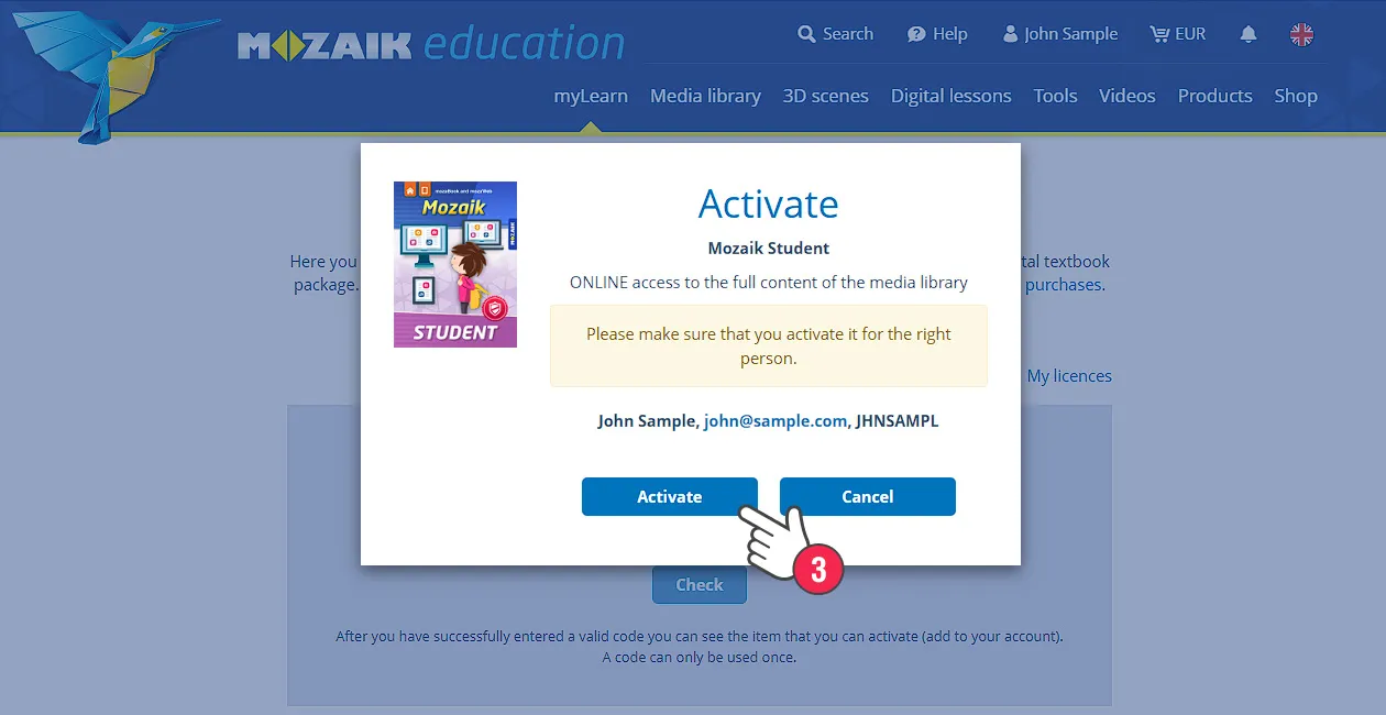 Do to that you simply have to go to log into mozaWeb then click on myLearn => Activate new code and enter or paste the licence code into the provided field.
