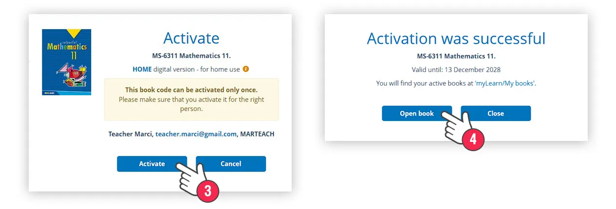 Caso tenha introduzido um código válido, irá surgir uma mensagem com os detalhes do livro em questão. Se estes detalhes estiverem corretos, clique em 'Ativar' (4). No caso de uma ativação bem-sucedida, irá aparecer uma mensagem com informações acerca da validade do livro, sendo possível desde logo abrir o livro ativado (5).