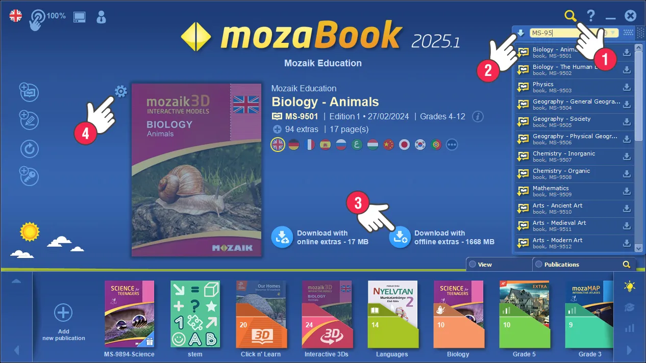Na Estante, clique no ícone de Lupa perto do canto superior direito do ecrã, digite MS-95 e, da lista de resultados da busca, descarregue a versão offline dos livros que correspondam à sua disciplina (Física, Biologia, etc).