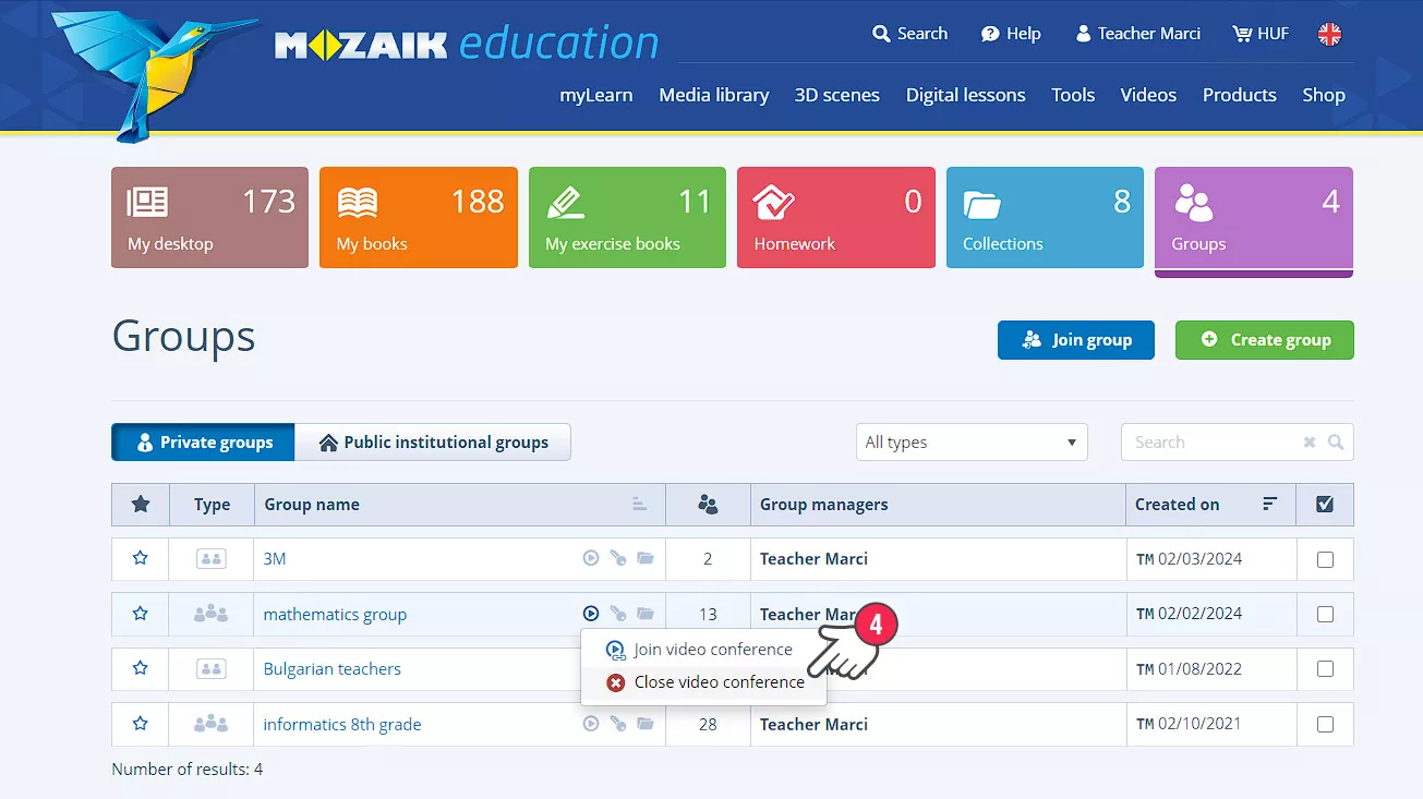 The video conference remains active for a while even after logging out, and by clicking on the join button, it is still possible to enter the call. By clicking on the close video conference button (4), teachers can end the call.
