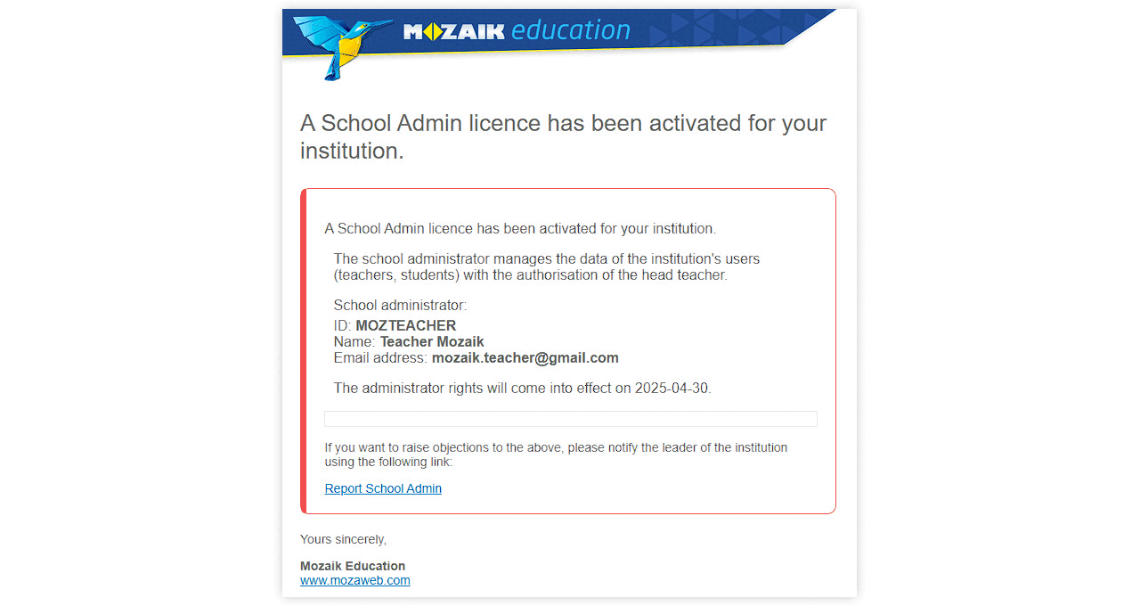 For safety reasons, when activating a School Admin licence, every user of the institution (teacher, student) will receive an email notification, informing them that the person who has activated the licence will manage their data as a user with School Admin rights. The email notification includes the name, the mozaWeb username and the registered email address of the person who activates the licence.