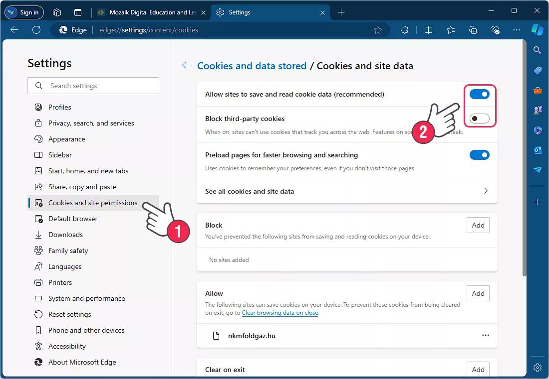 Te recomendamos deseleccionar la opción Bloquear todas las cookies (2).