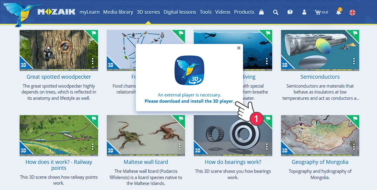 If the player is not installed on your device, mozaWeb will automatically prompt you to download it, as soon as you click on a scene. Click on the message displayed in the centre of the page to download the player (1).