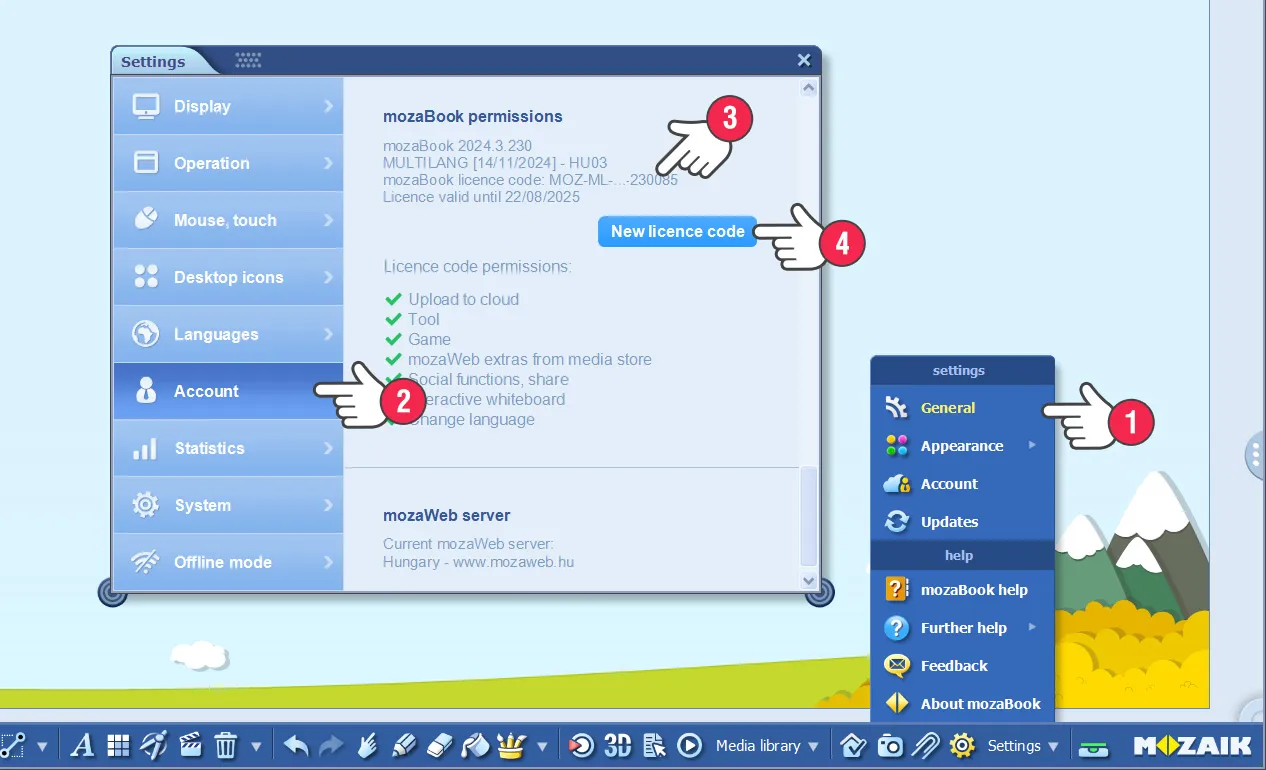 Scroll to mozaBook permissions to view the six-digit code of your licence (3).