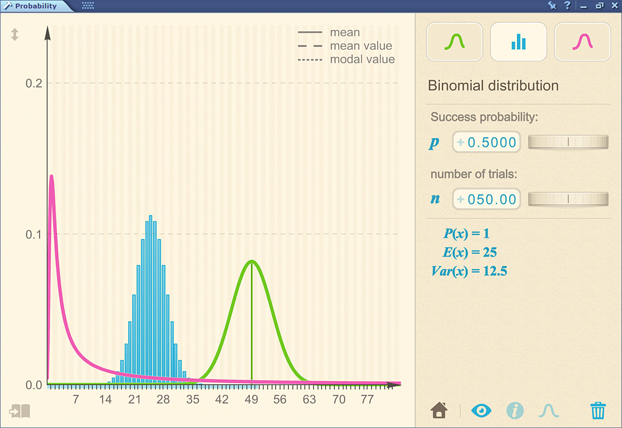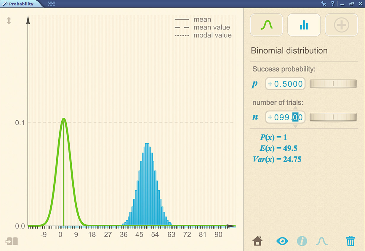 But the best feature of all is definitely the possibility to superimpose different distributions and play around with them. Here we can see how, as the number of trials in a binomial distribution increases, the distribution resembles a normal distribution more and more.