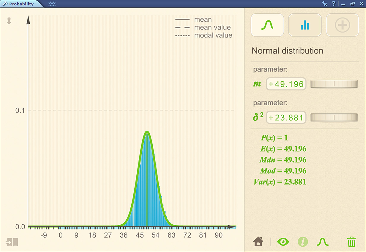 We can view up to three distributions simultaneously on the same chart. Let’s have a look at a burr (pink) a binomial (blue) and a normal distribution, all displayed at the same time.