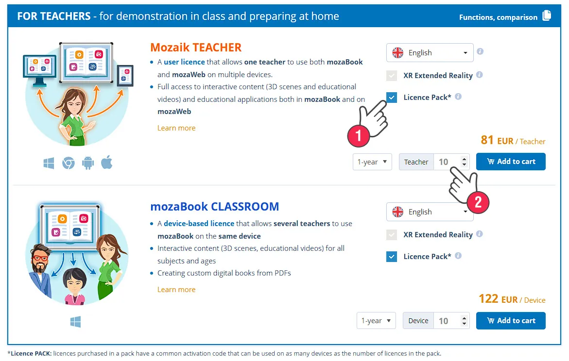 Tanto las licencias para profesores (Mozaik TEACHER y mozaBook CLASSROOM) como también las licencias para alumnos (Mozaik STUDENT y mozaBook SCHOOL-LAB) se pueden comprar con el descuento Licencia Pack.