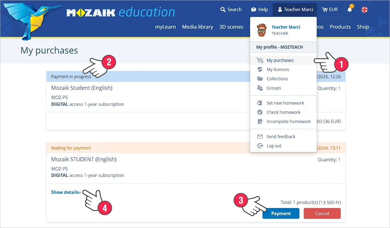 Puedes seguir el estado de tus pedidos haciendo clic en Mis compras (1). Nuestro sistema espera 30 minutos para recibir la confirmación del pago del proveedor de servicios seleccionado. Hasta que llegue la confirmación, el estado de tu pedido es Pago en curso (2). Al cabo de 30 minutos o si la operación es fallida, el estado cambiará a A la espera del pago. En este caso, haciendo clic en Pagar (3), puedes elegir otra vez el método de pago (no necesariamente el mismo que antes) o escogiendo el botón rojo Cancelar, puedes cancelar tu pedido. Puedes ver los detalles del pedido (por ejemplo, en el caso de un pago exitoso, el código de activación) en el enlace Mostrar detalles (4).
