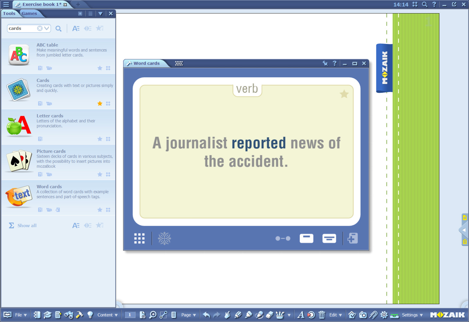 Among the mozaBook applications you can find several options to improve and expand the vocabulary of the students. Give your pupils the experience of practicing words with the help of customized Word cards that are designed to provide the language learner with a word, part of speech tags, and even example sentences. Teach the proper spelling of longer expressions, or how to use false friends playfully, with the help of fun games or by competing with fellow students.