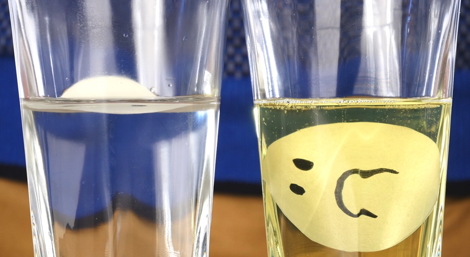 Este experimento demonstra como um pedaço de papel flutua em um tipo de líquido, mas afunda em outro.