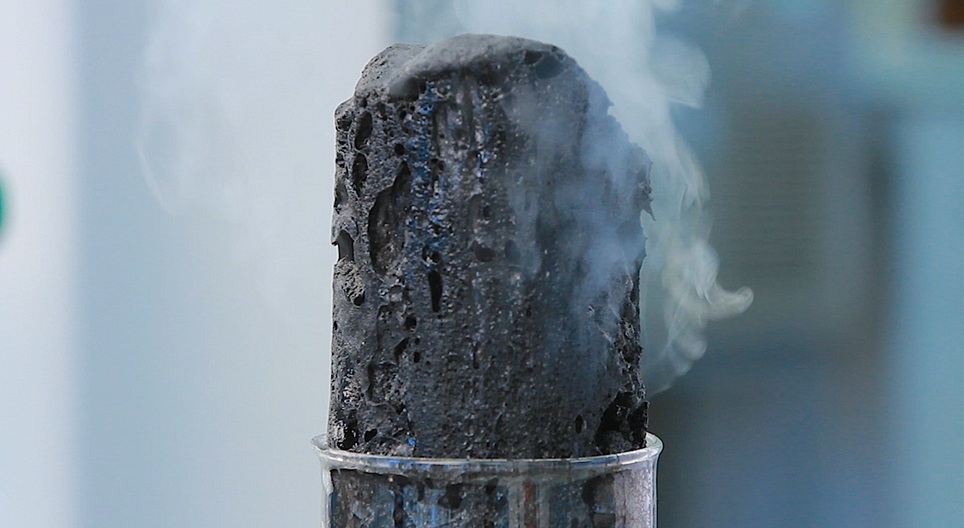 Nesse experimento, a sacarose reage com o ácido sulfúrico..