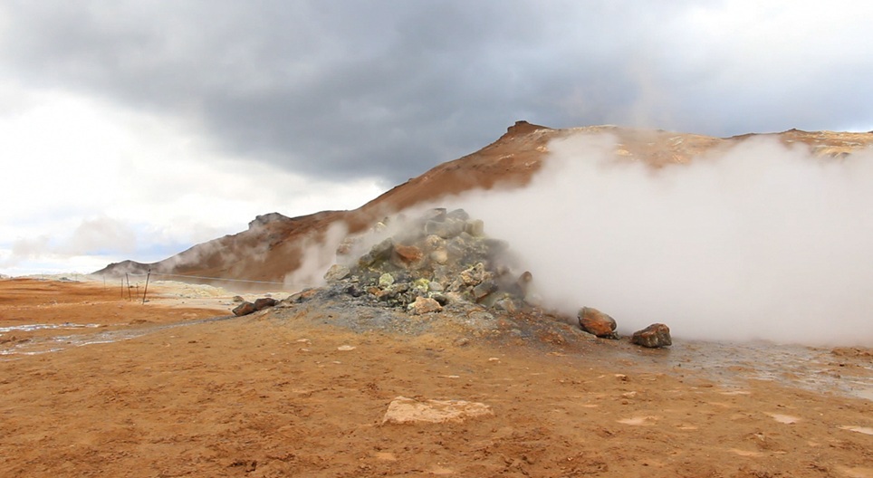 Os resultados espetaculares da atividade vulcânica em alguns pontos quentes são a erupção de água, vapor e enxofre descolorando o terreno circundante fazendo-o parecer com a paisagem marciana.