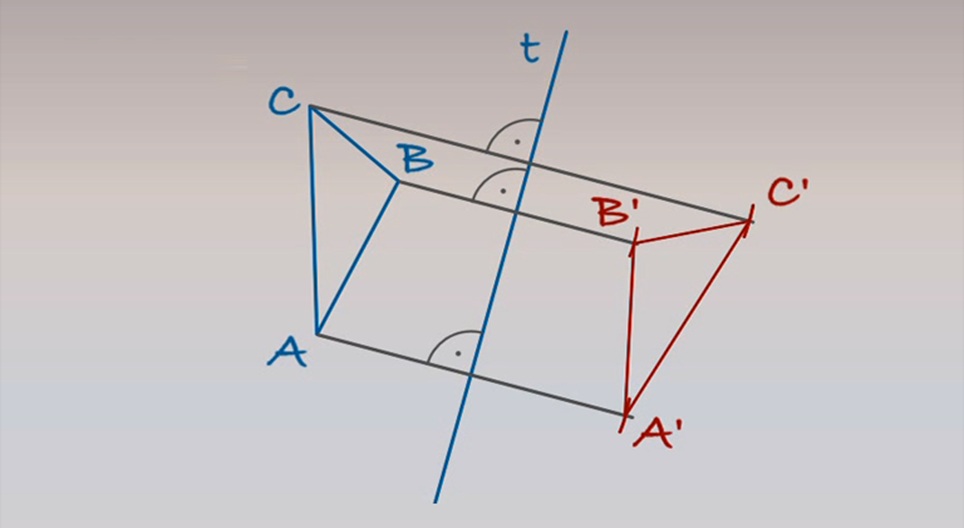 O eixo t e o triângulo ABC são dados num plano particular. Tracemos a imagem especular do triângulo ABC!