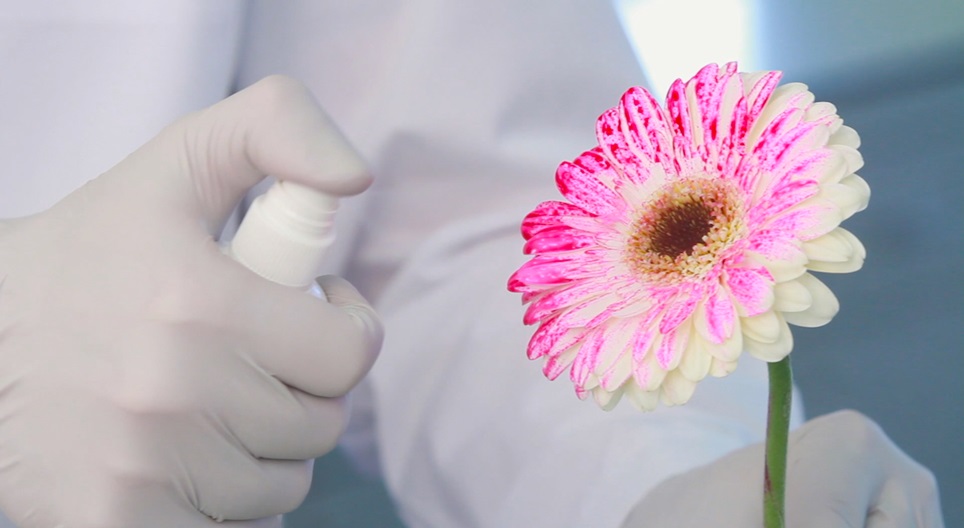 Vaporizamos um líquido transparente nas pétalas de uma flor e vemos como se tornam roxas. Aprendemos o truque químico atrás do fenômeno.