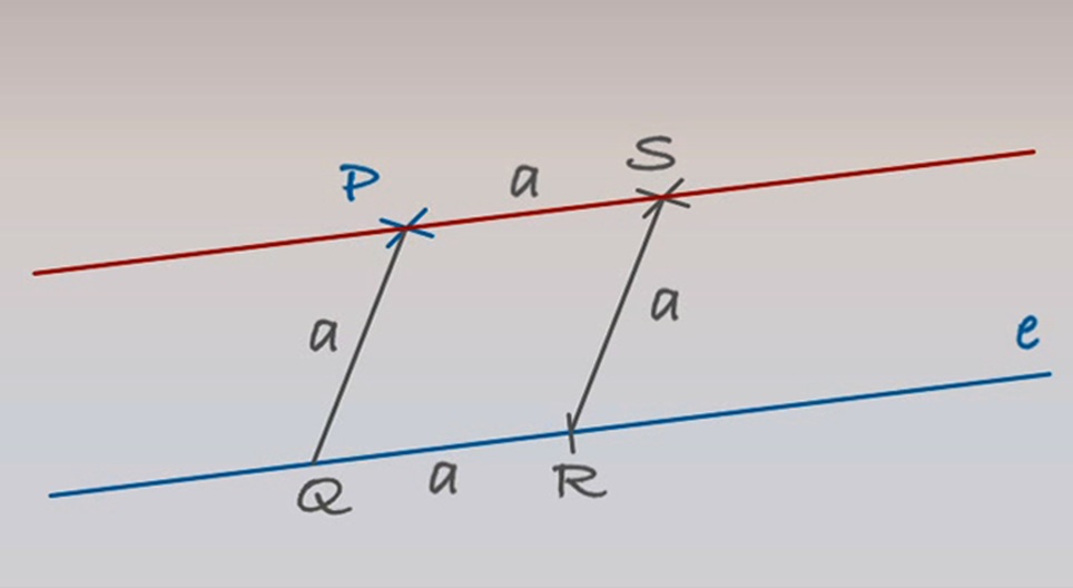 Construamos um losango um dos lados do qual fique na linha e; e o ponto P seja um dos vértices no lado oposto.