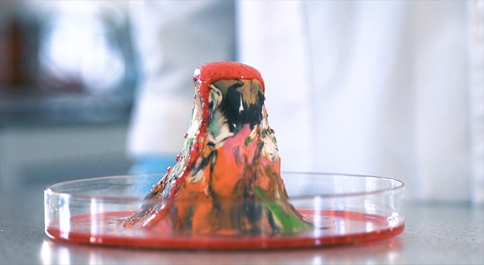 A reação entre o bicarbonato de sódio e o vinagre tingidos com corante alimentar vermelho, assemelha-se a uma erupção vulcânica.