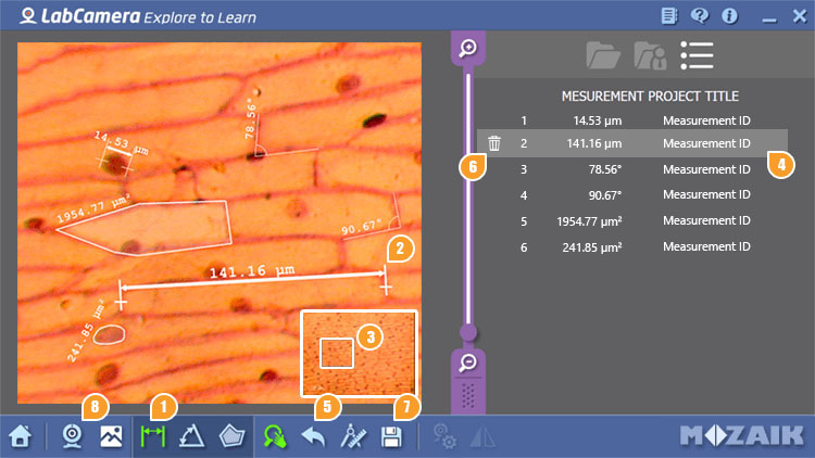 Área de medição|Clique ao redor da área desejada para limitá-la. Assegure-se de que o último clique seja o mesmo ponto de seu ponto inicial. A área será calculada em píxeis ou em unidades de medição definidas durante a calibração. Quanto mais segmentos você definir, mais próxima sua medição será da área do objeto real. | |